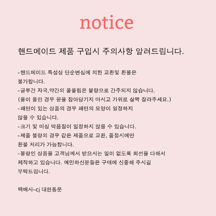 *핸드메이드 특성상 주문후 제작되는 제품이므로 주문후 단순변심에 의한 교환이나 환불은 불가합니다.