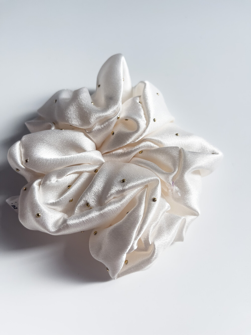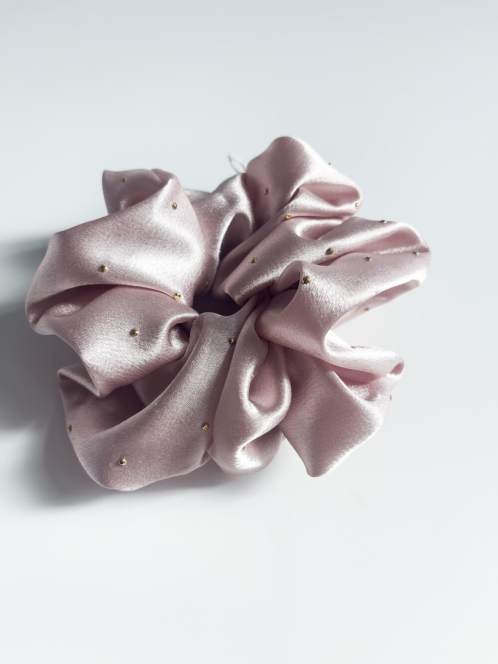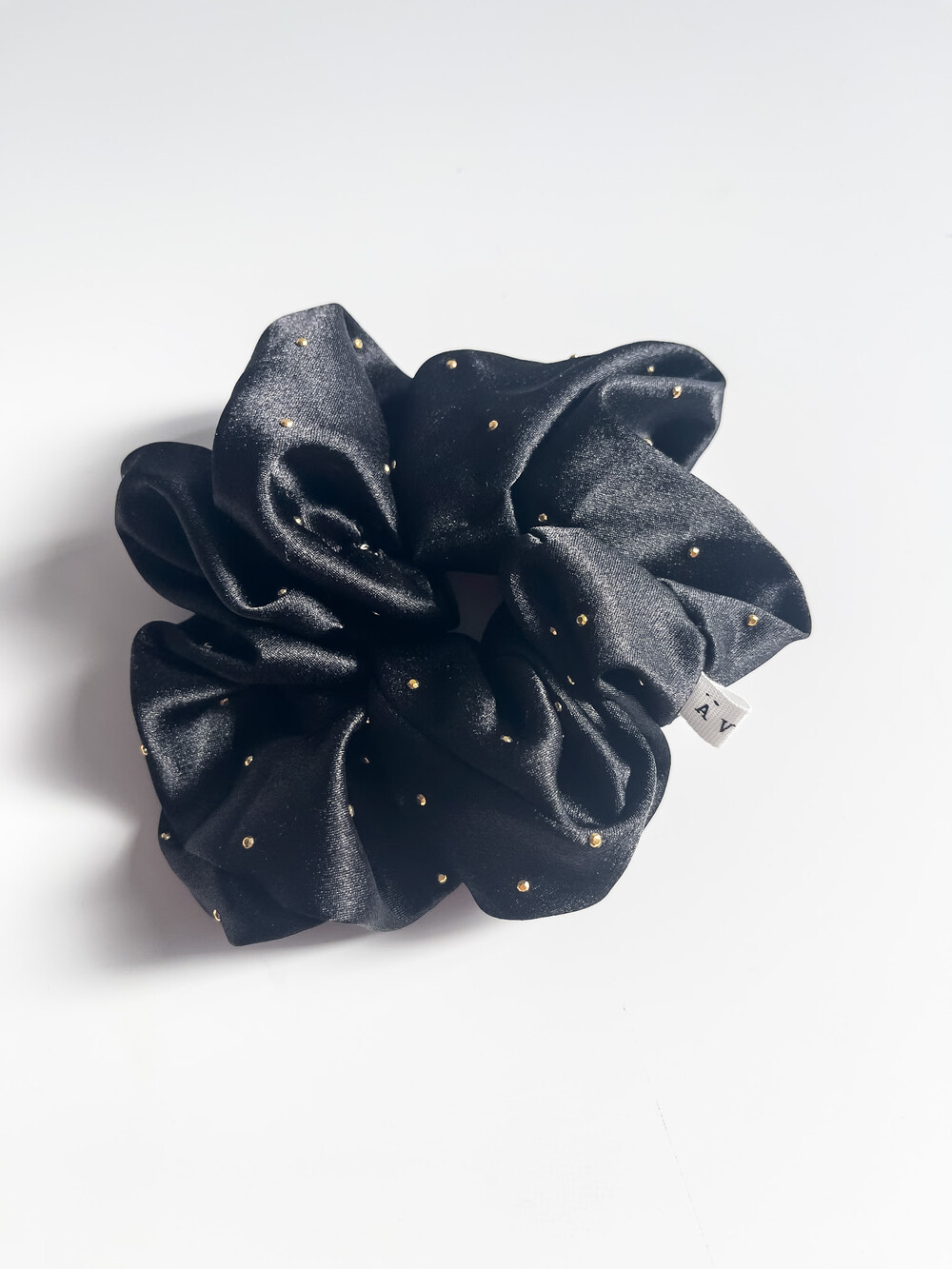 골드 도트가 박혀있는 부드러운 실크 느낌의 헤어스크런치 입니다.
