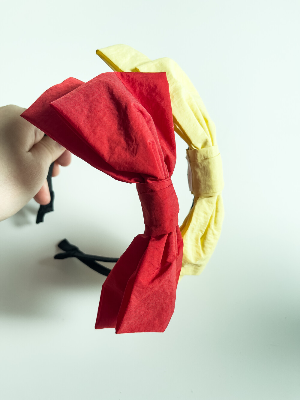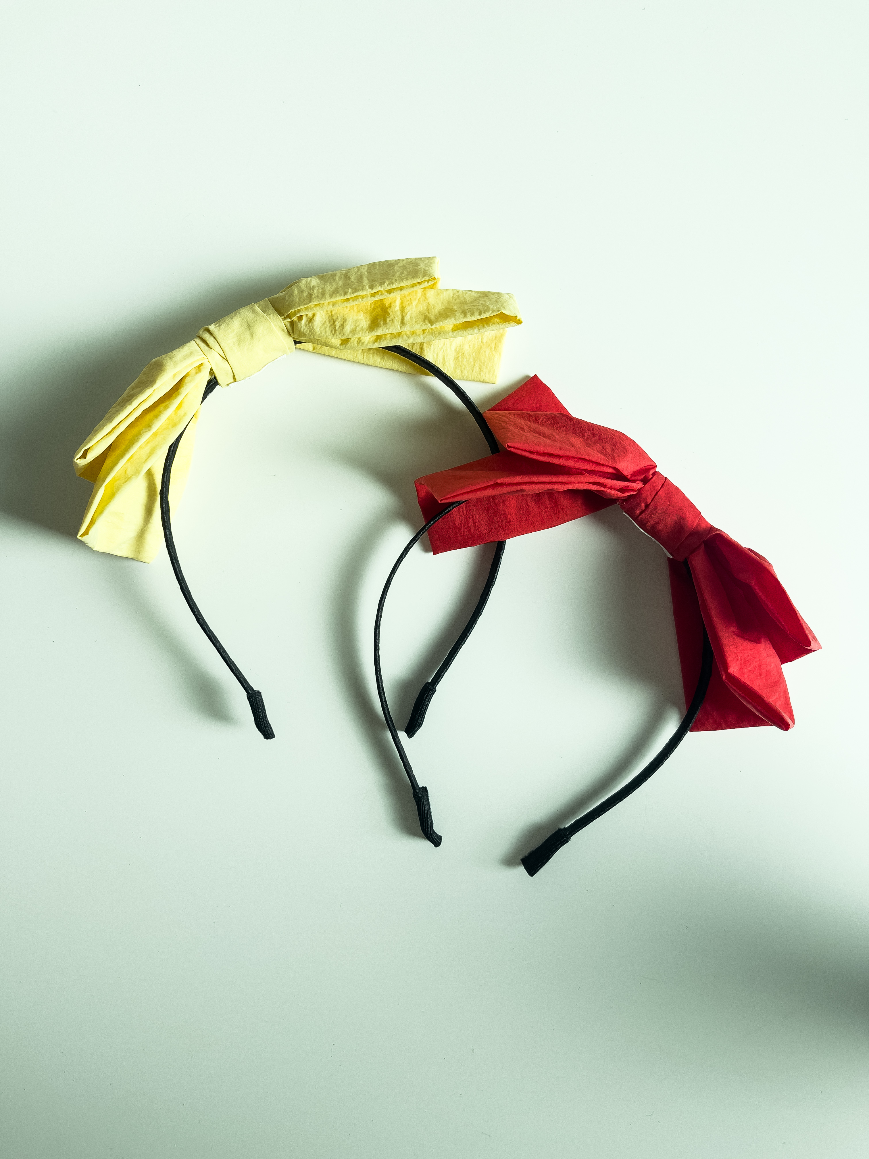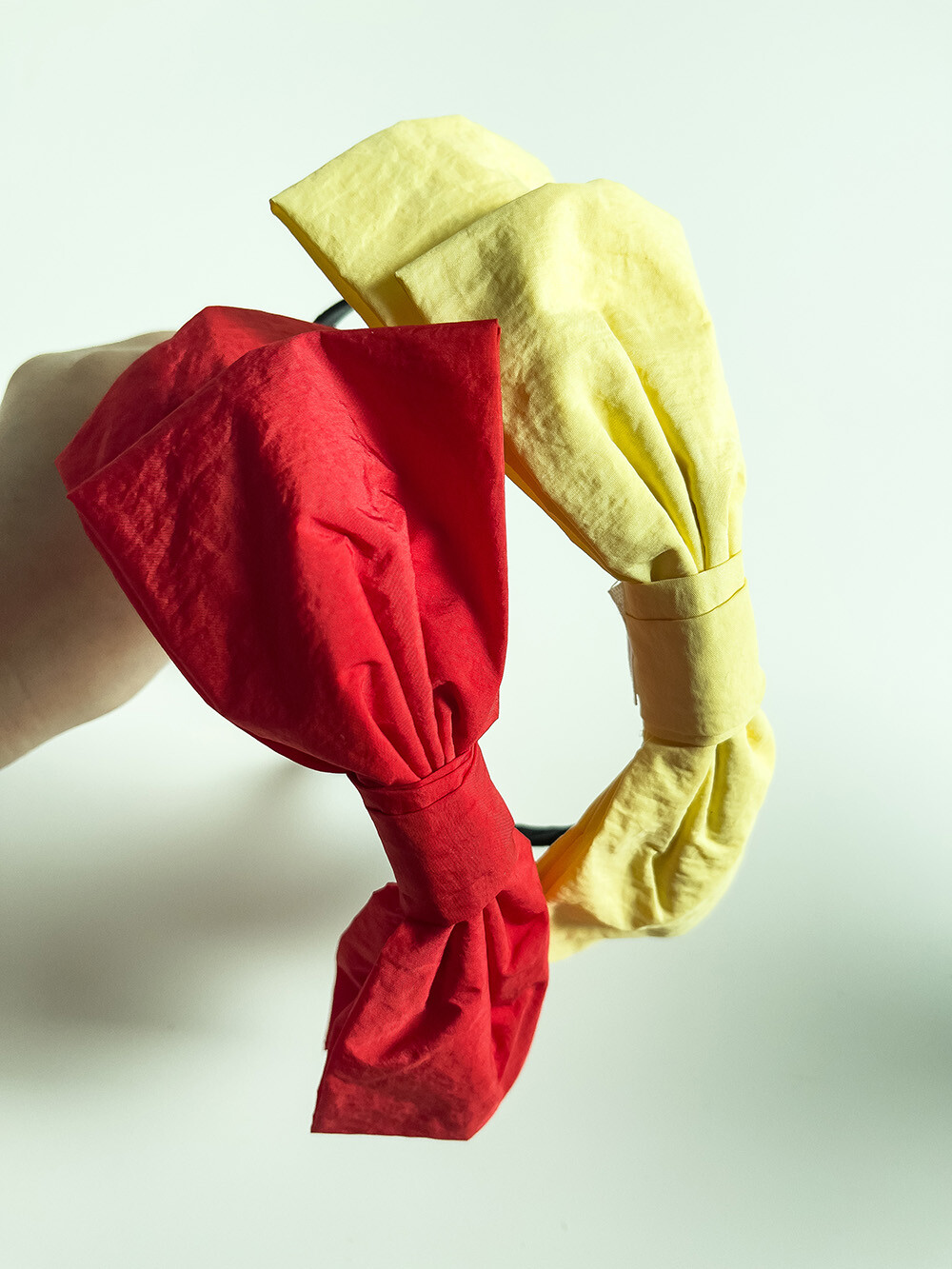 비비드한 컬러의 왕리본 머리띠입니다.