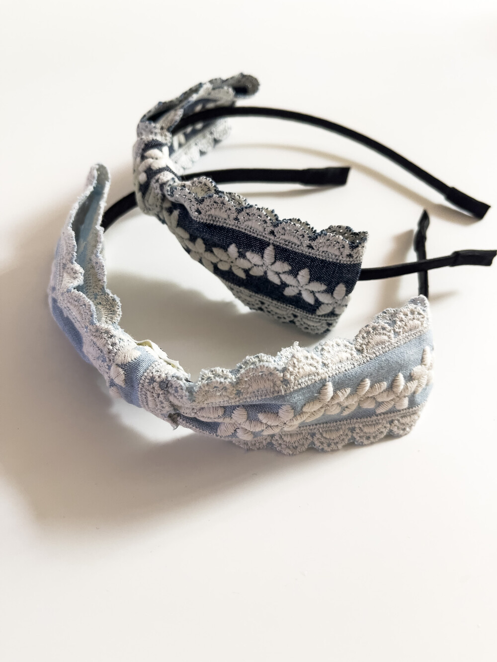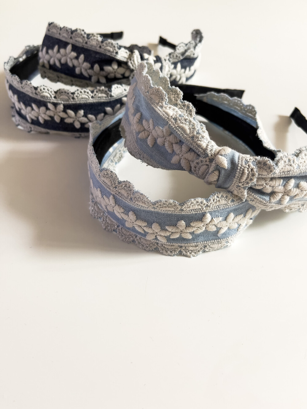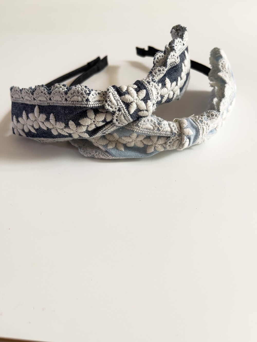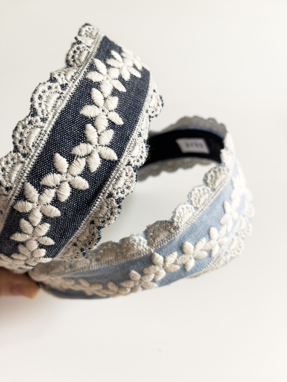 데님과 레이스자수가 조화로운 헤어밴드입니다.