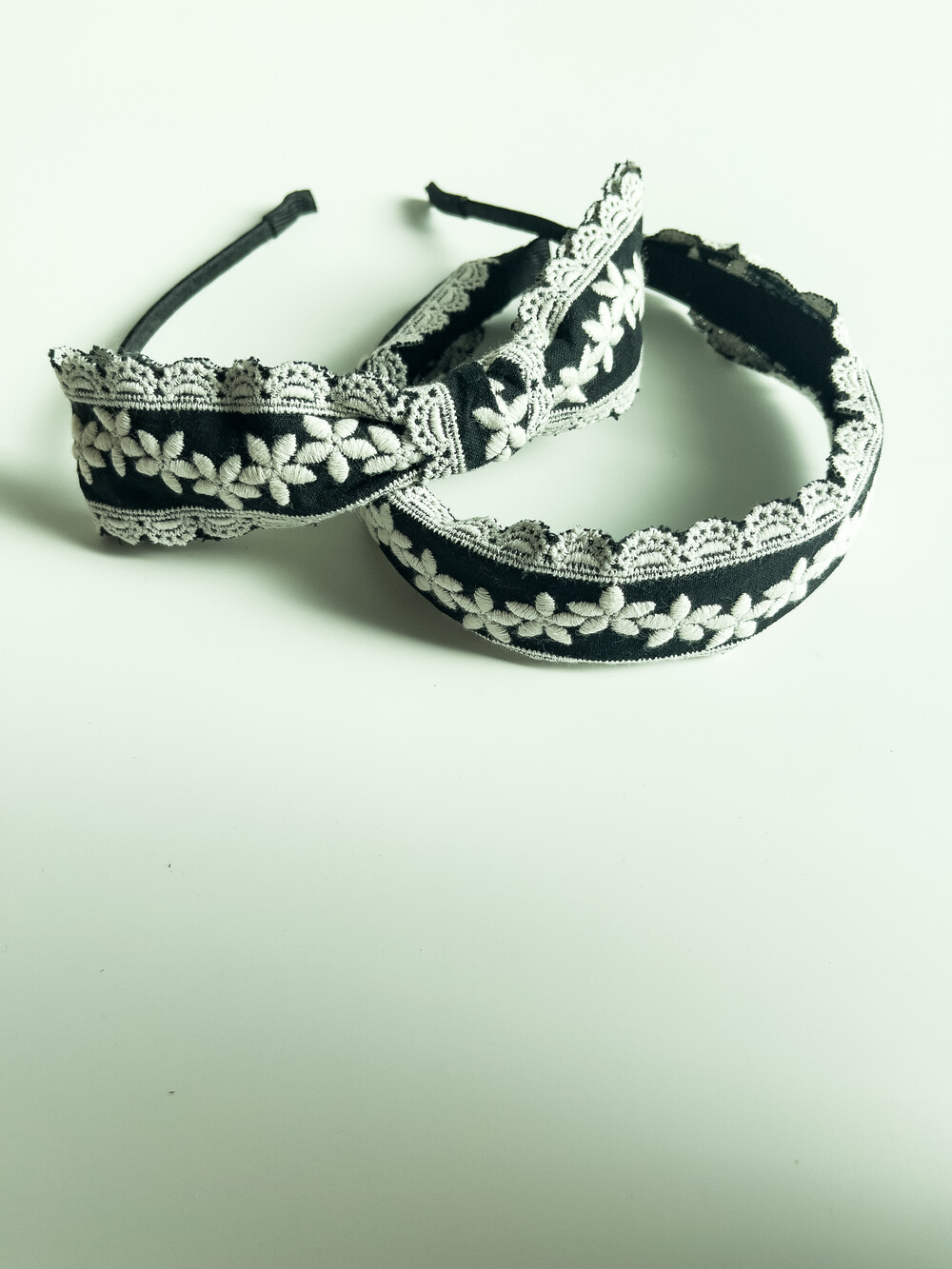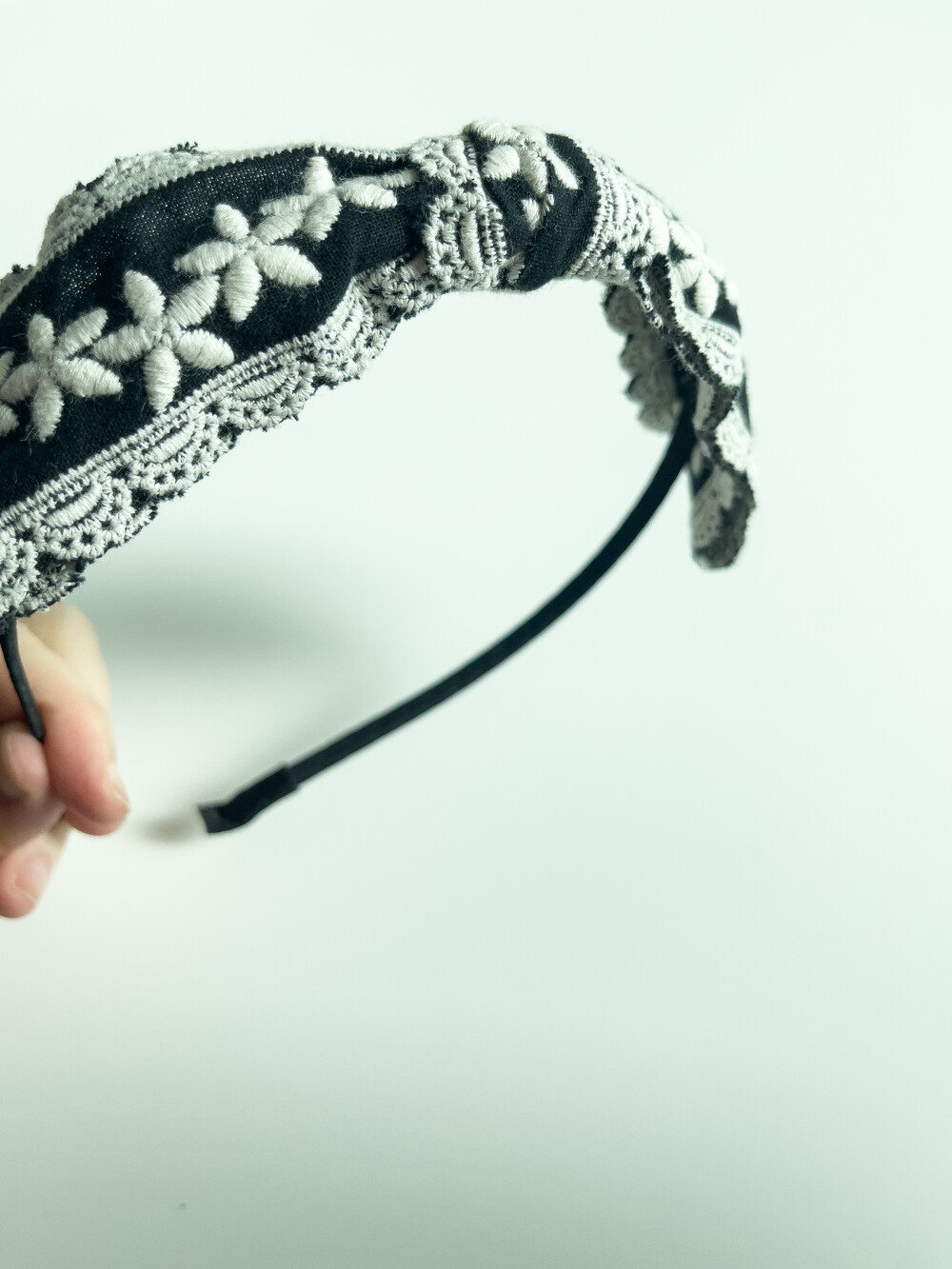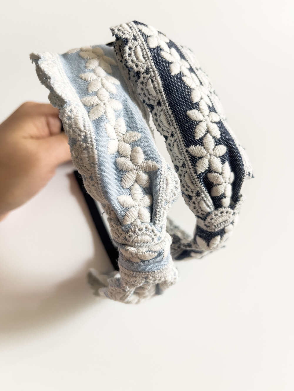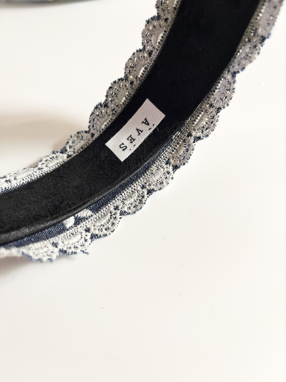 데님과 레이스자수가 조화로운 헤어밴드입니다.