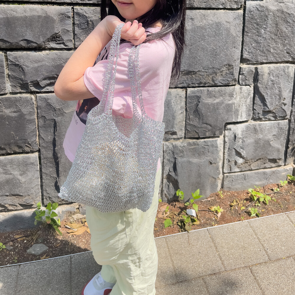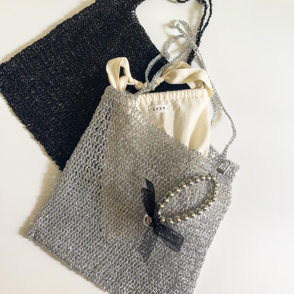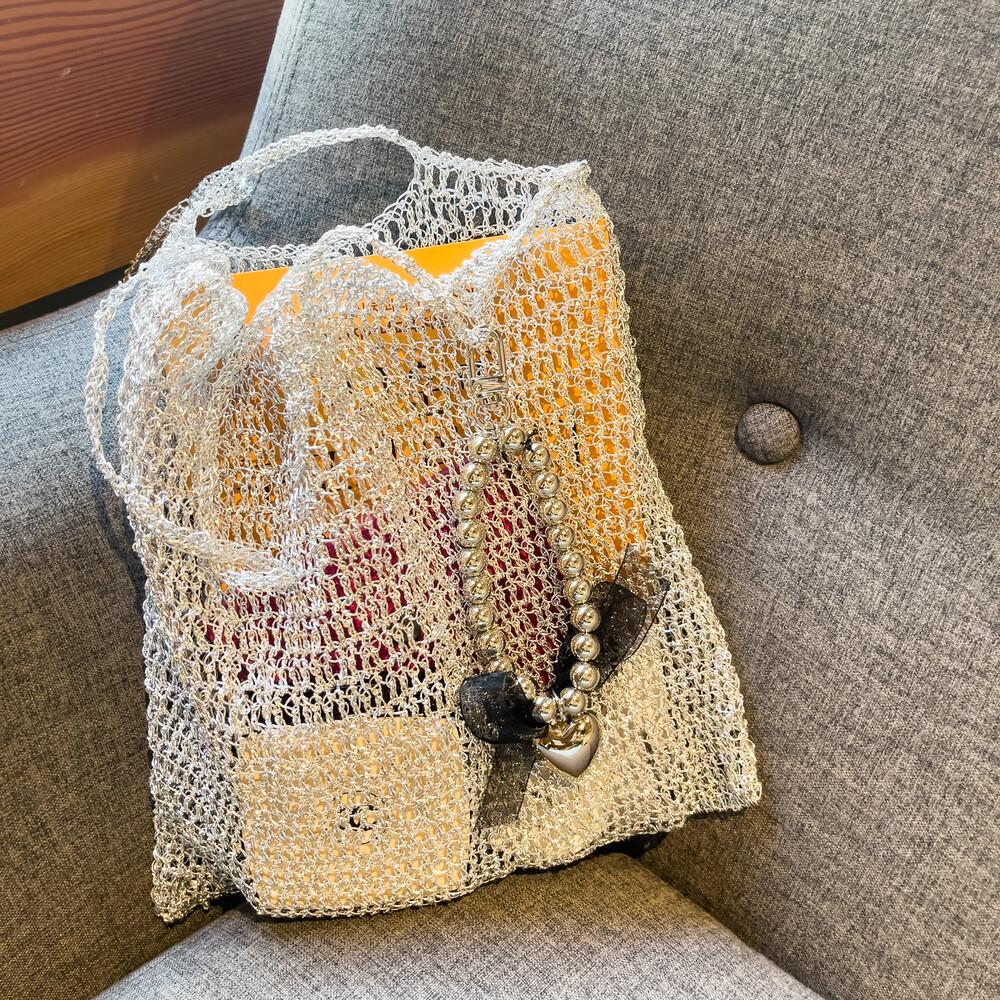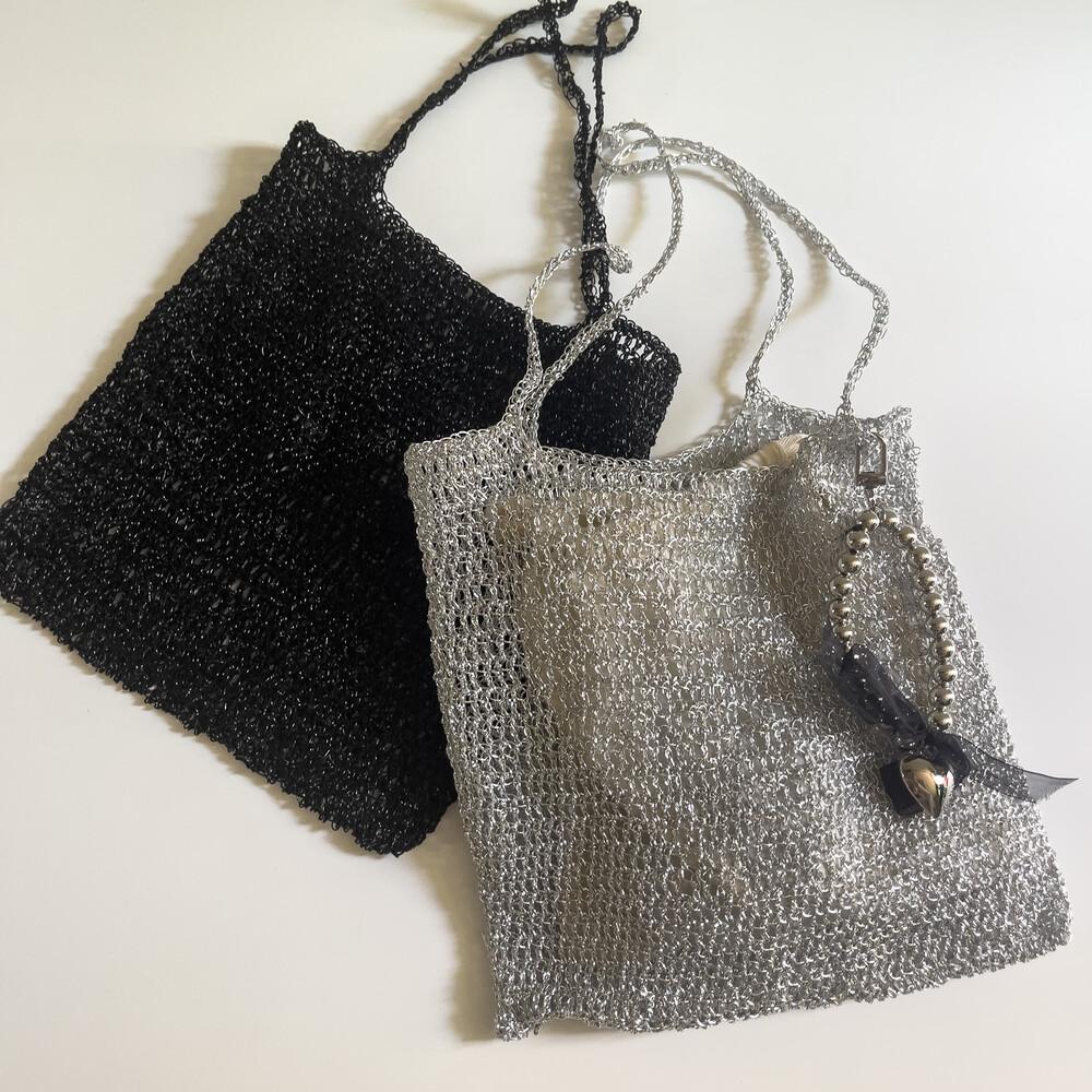 올해 유독 눈길이 가는 실버컬러 메탈 코드사로 촘촘히 만든 니팅백입니다.