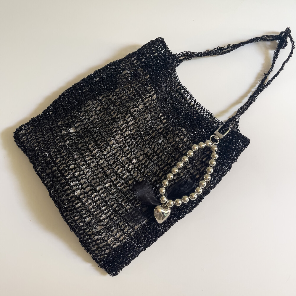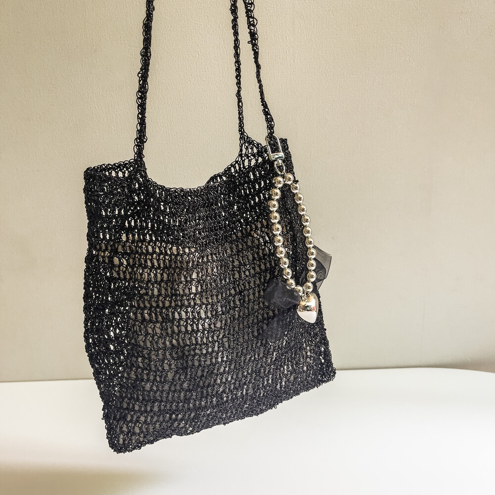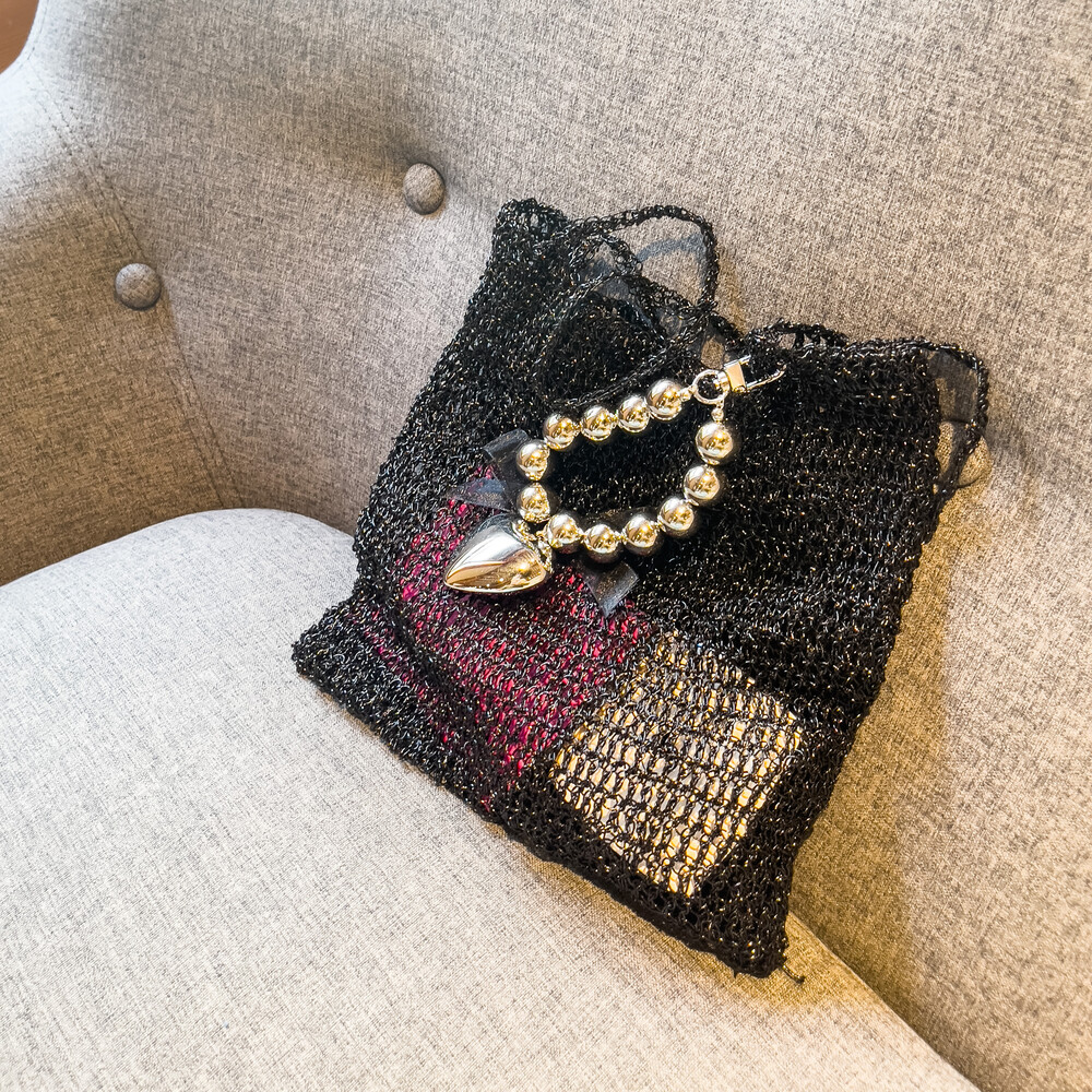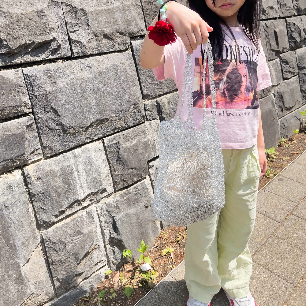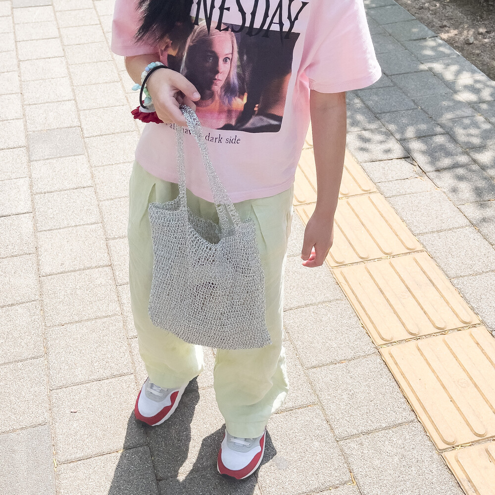 올해 유독 눈길이 가는 실버컬러 메탈 코드사로 촘촘히 만든 니팅백입니다.