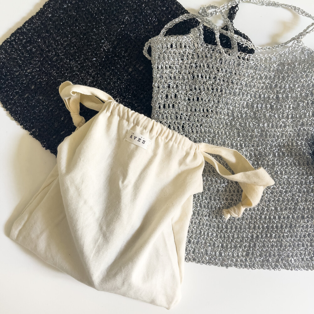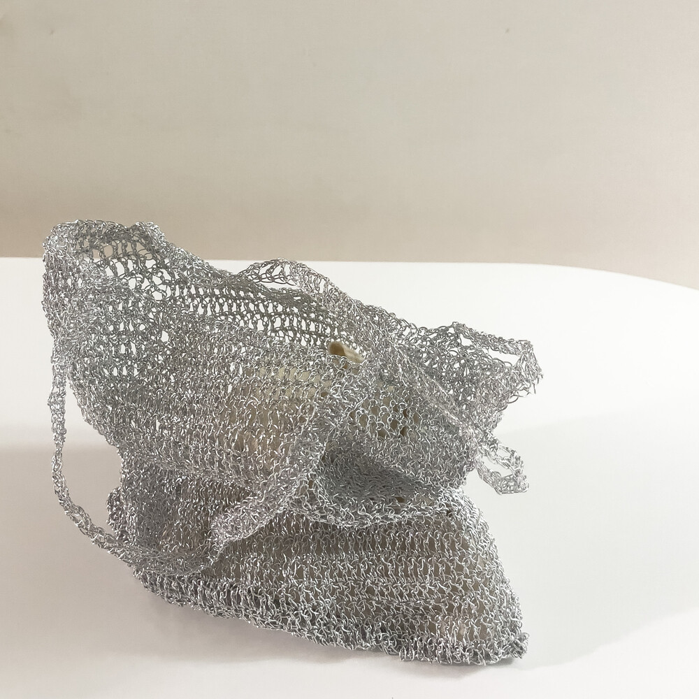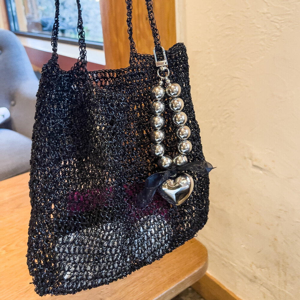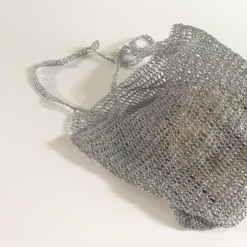 올해 유독 눈길이 가는 실버컬러 메탈 코드사로 촘촘히 만든 니팅백입니다.