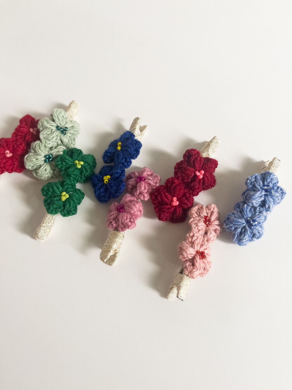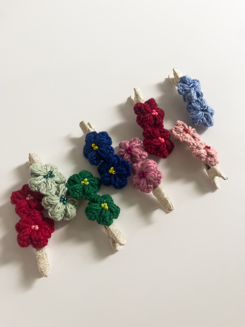뜨개질로 제작한 집게핀입니다. 골드컬러의 테이프로 얇은 핀대를 감아
